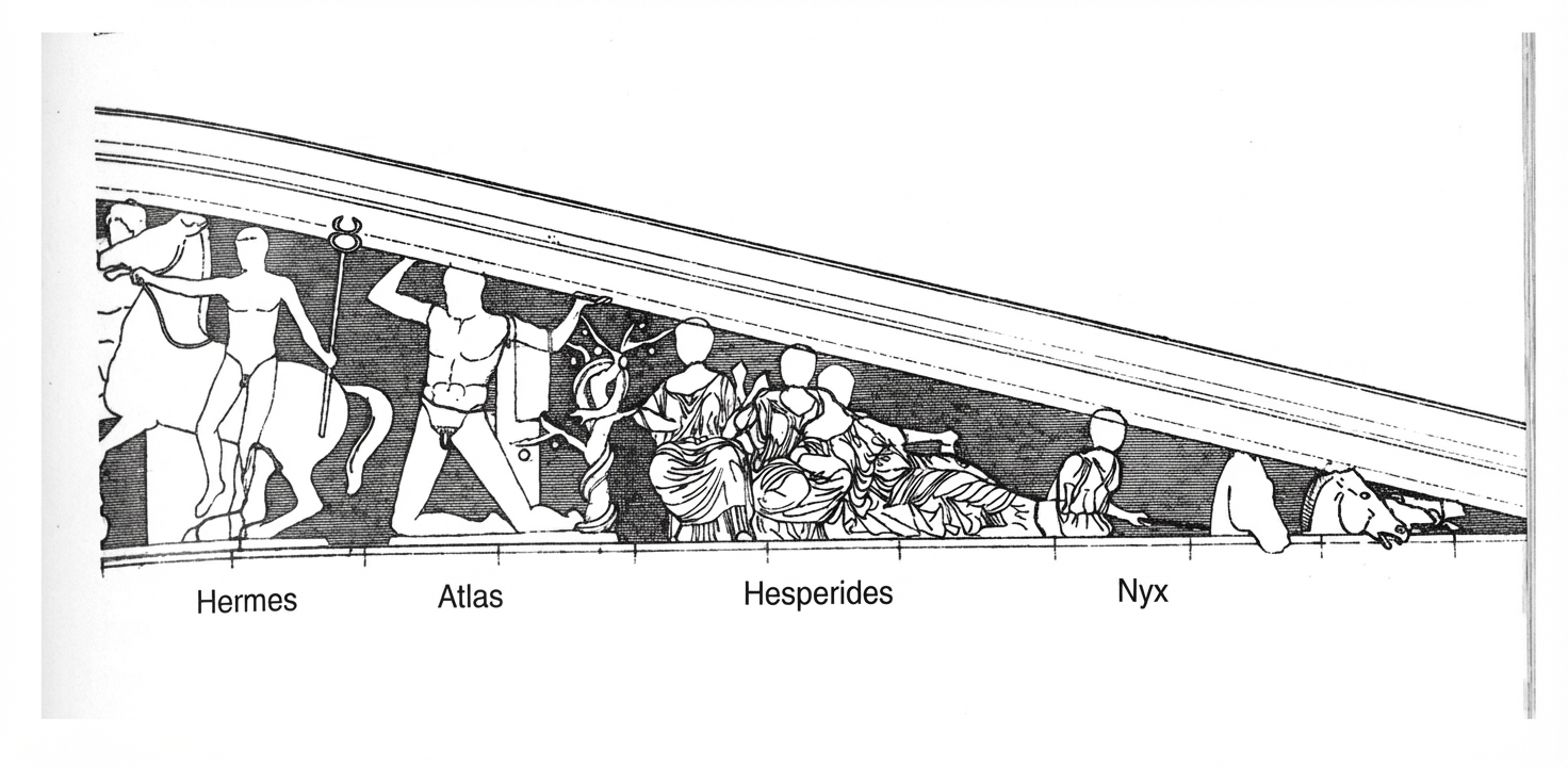 C’est elle qui est représentée à l’extrémité droite du fronton. Elle quitte la scène conduisant son quadrige. Phidias nous montre comment, à partir du Chaos par l’intermédiaire de la Nuit, l’ordre s’est instauré dans le monde grec. Hésiode ne remonte pas, au-delà de Chaos, jusqu’au Créateur de la Genèse. La Nuit engendra les Hespérides, les nymphes de l’ouest, gardiennes du jardin paradisiaque où se trouve l’arbre aux pommes d’or et l’inévitable serpent lové autour de l’arbre. La Nuit engendra aussi les trois Destinées, les Parques des Latins, que nous retrouverons dans la partie gauche du fronton. La Nuit s’en va sur son char, laissant derrière elle les Hespérides et leur arbre. Nous avons donc le décor du drame et sa véritable origine : la possession de la pomme.