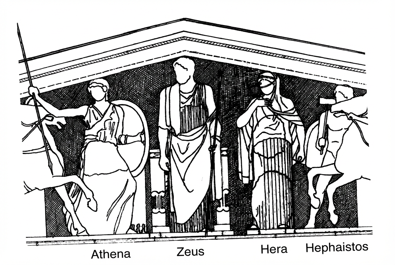 Le centre du fronton nous a présenté les quatre personnages liés directement à la naissance d’Athéna. Mais cet évènement n’est pas le commencement du cosmos grec. Puisque, selon Pausanias, la totalité des sculptures se rapporte à Athéna, il faut s’attendre à trouver dans les autres parties du fronton une évocation des personnages importants liés, d’une façon ou d’une autre, à Athéna.