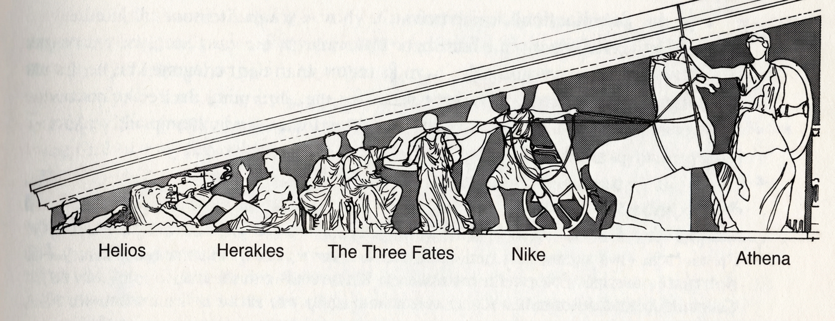 L’angle gauche du fronton Est du Parthénon est occupé par Hélios, le Soleil, conduisant son quadrige. Mais alors que la Nuit, qui occupe symétriquement l’angle de droite, symbole du monde ancien, s’éloigne de la scène, Hélios regarde vers Athéna. La scène semble tirée de L’Hymne à Pallas Athéna d’Homère: » Je commence le chant de Pallas Athéna…Mais Athéna jaillit de la tête immortelle et se tient debout devant Zeus…Le brillant fils d’Hypérion [Hélios] arrêta ses chevaux aux pieds légers pendant un long moment, jusqu’à ce que la vierge Pallas Athéna eût retiré l’armure céleste de ses immortelles épaules. Et Zeus le sage fut satisfait. »