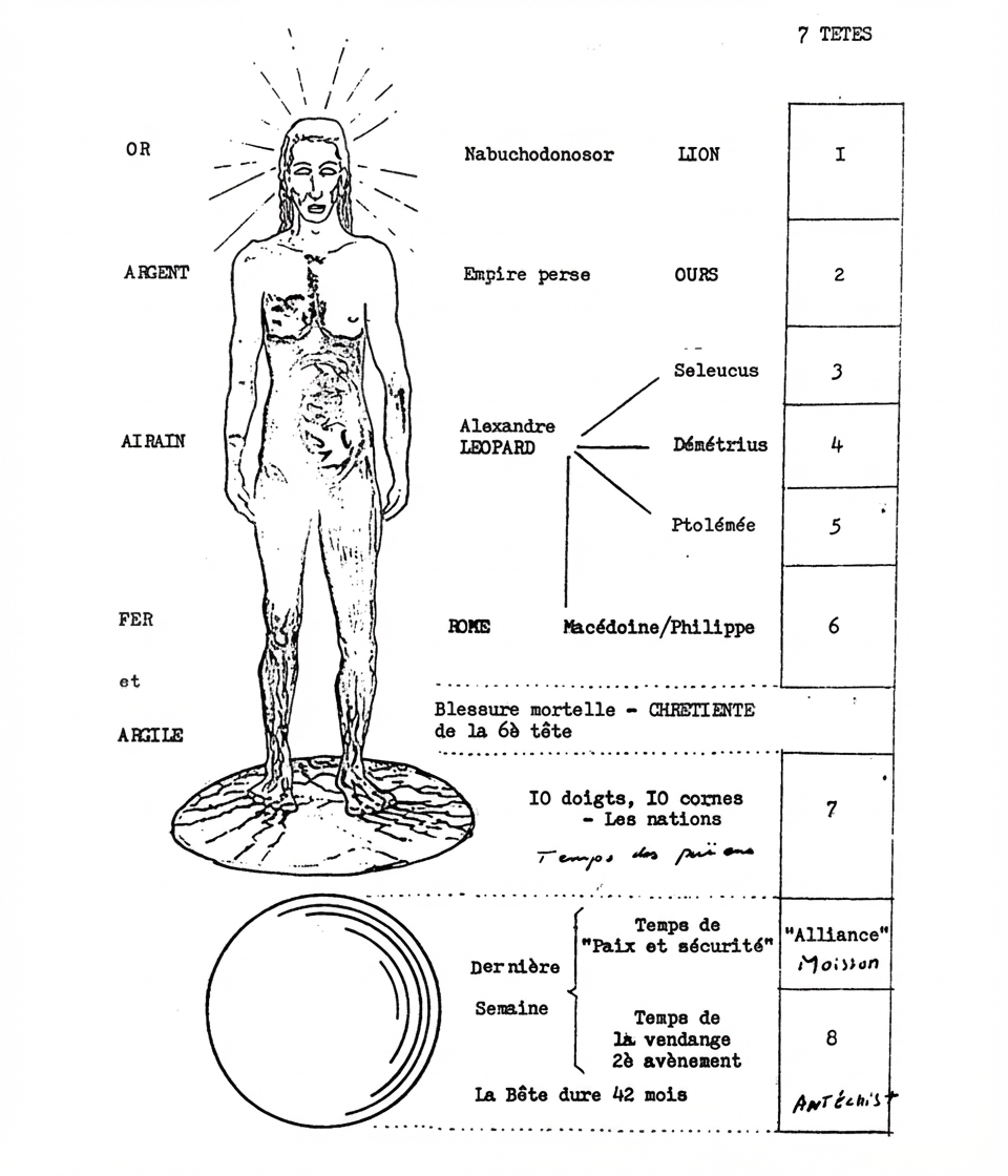 « Après les jambes de fer de la statue, que reste-t-il sinon les pieds, aux dix doigts faits d’un mélange d’argile et de fer ? Ces dix doigts correspondent aux dix cornes. » (cf. Dan 7,7 et Ap 13,1)