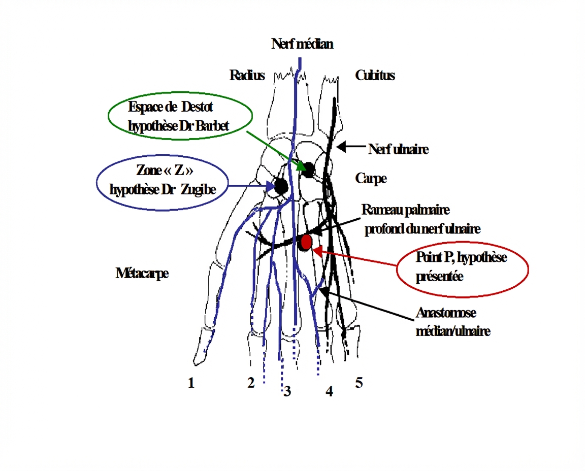 La figure 2 montre une vue palmaire de la main. Sont représentés sur cette figure les emplacements d’enclouage d’après les principales hypothèses, ainsi que le cheminement des nerfs médian et ulnaire dans la région du carpe et du métacarpe :