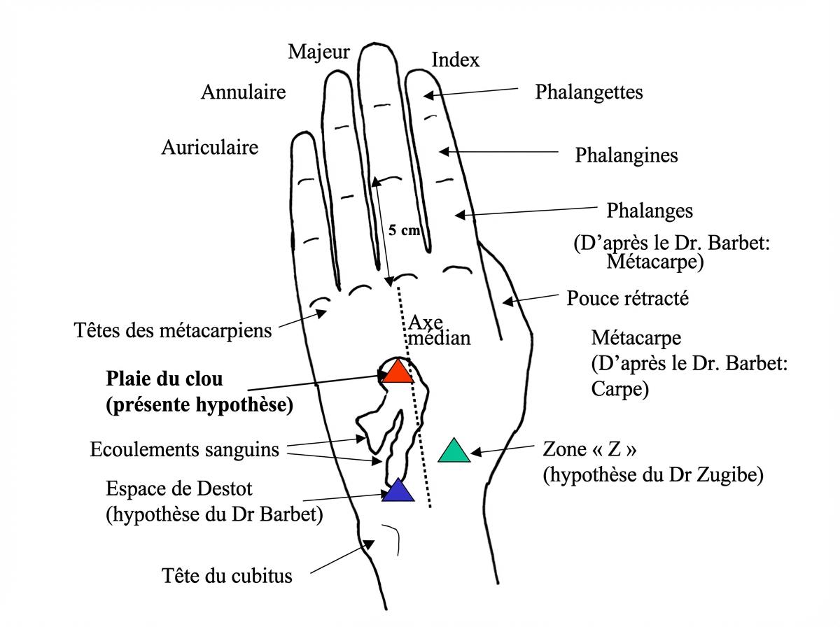 Notons bien que l’hypothèse de localisation du clouage dans la paume est basée principalement sur l’observation de l’image et de l’empreinte sanguine de la main gauche telle qu’apparaissant sur le Linceul. Les conséquences qui en découlent sont :