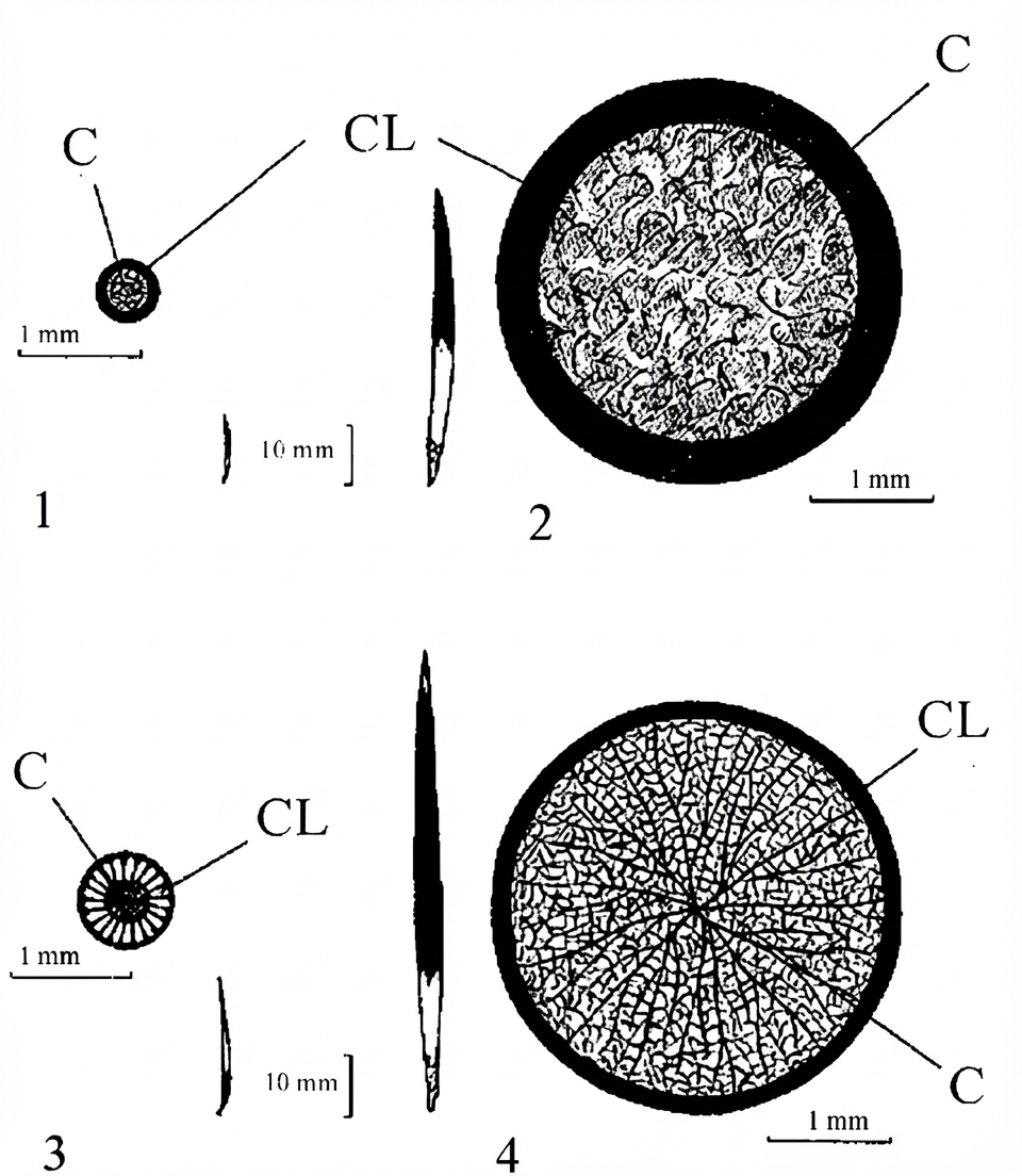 Fig. 15. Schéma des sections transversales des épines de : 1- Echinops telfairi (Tenrec); 2 - Tachyglossus aculeatus (Echidné); 3- Erinaceus concolor (Hérisson); 4- Hystrix indica (Porc-épic) CL - couche corticale; C- noyau.