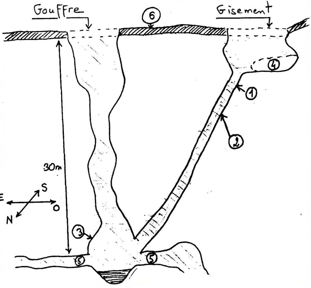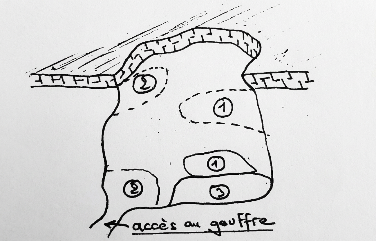 Fig.4 : Vue du gouffre et du gisement (coupe verticale). NB. Le gisement se prolonge certainement sous la maison