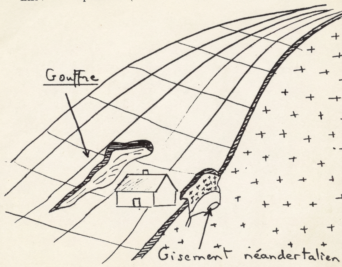 Après avoir retiré des milliers de mètres-cubes, il atteignit le fond d’où il dégagea, sur 10 à 20 mètres, huit départs en étoile de galeries presque àl’horizontale, sauf une qui remonte vers la nécropole néandertalienne. L’ensemble avait été creusé par l’eau.