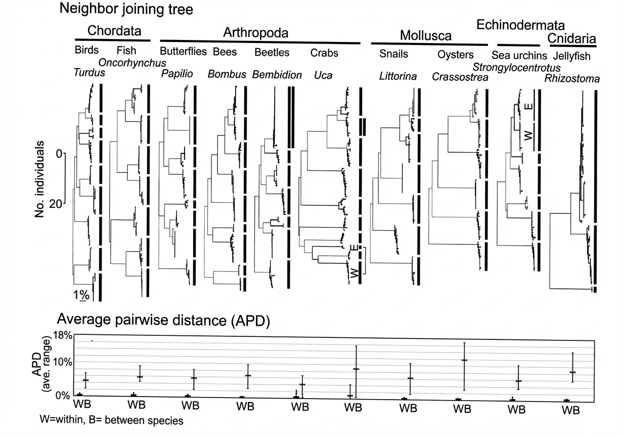 Dans le tableau inférieur, les écarts moyens (trait gras horizontal) et la dispersion (trait fin vertical) font voir une dispersion intraspécifique (W) minime (moins de 1 %), sauf chez les scarabées (2 %) et les crabes (4 %), tandis que les écarts interspécifiques moyens (B) varient de 4 % à 6 % en général (mais 9,5 % pour les crabes et 14 % pour les huîtres). Selon l’image évocatrice proposée par les auteurs : « Les espèces sont des îlots dans l’espace des séquences » (ST p. 9).