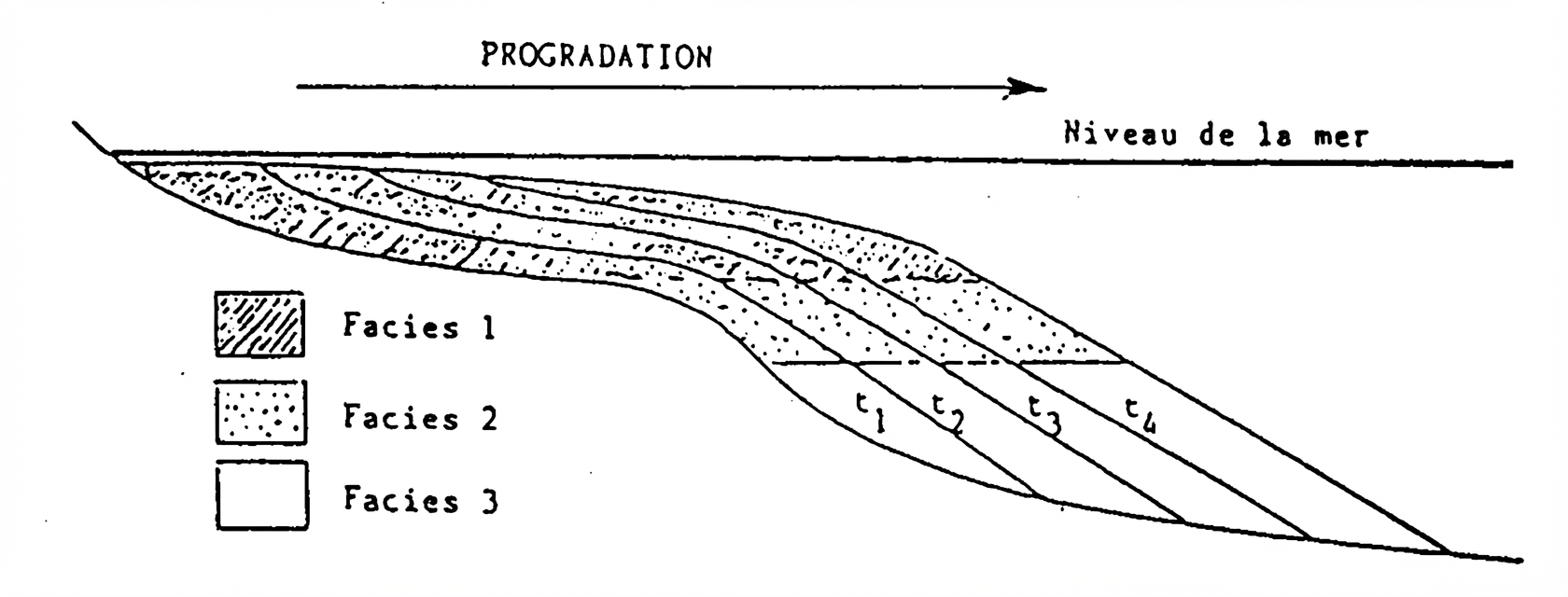 Fig.1 Les faciès 1, 2, 3 progradent vers le large aux temps t1, t2, t3, t4 et se superposent. Ils sont juxtaposés dans le paysage, au contact de l’eau qui transporte les sédiments.