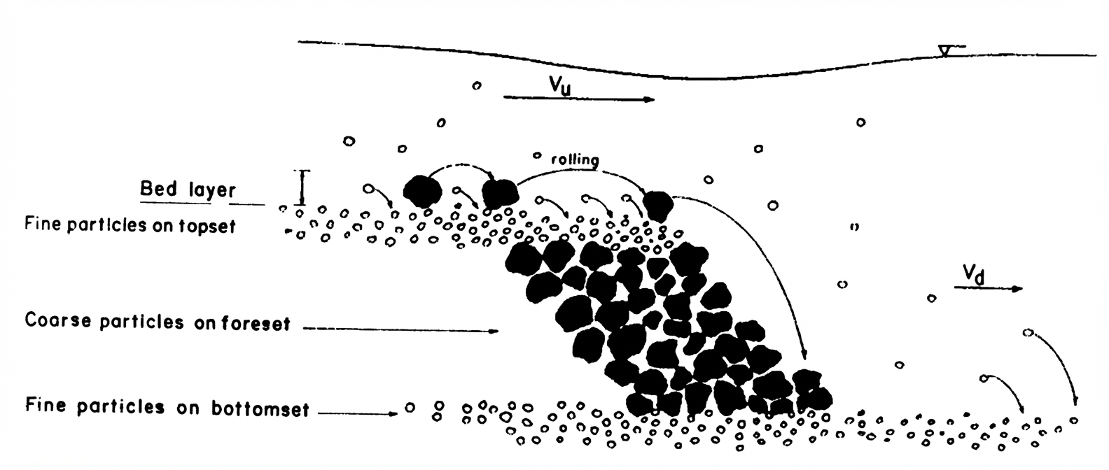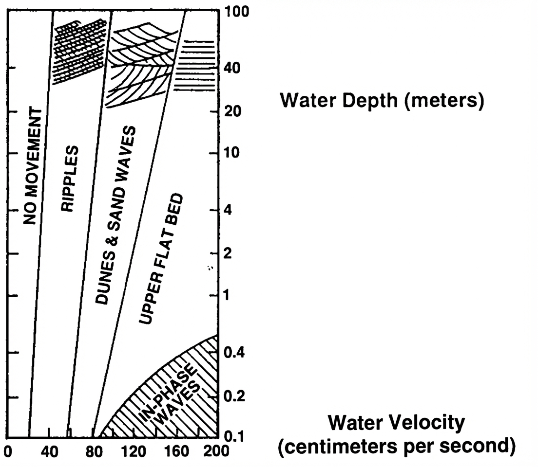 La formulation en Mécanique de la relation entre vitesse et dimension des particules, complètera, pour la stratification élémentaire, celles qui ont été établies entre les configurations-types de dépôts (rides, dunes, strates horizontales, anti-dunes), avec la vitesse, la profondeur et la dimension des particules, relations reconnues tant par Rubin dans la baie de San Francisco, que par Boguchwal et Southard (1990) dans les trente-neuf séries expérimentales en canal qu’ils ont référencées.