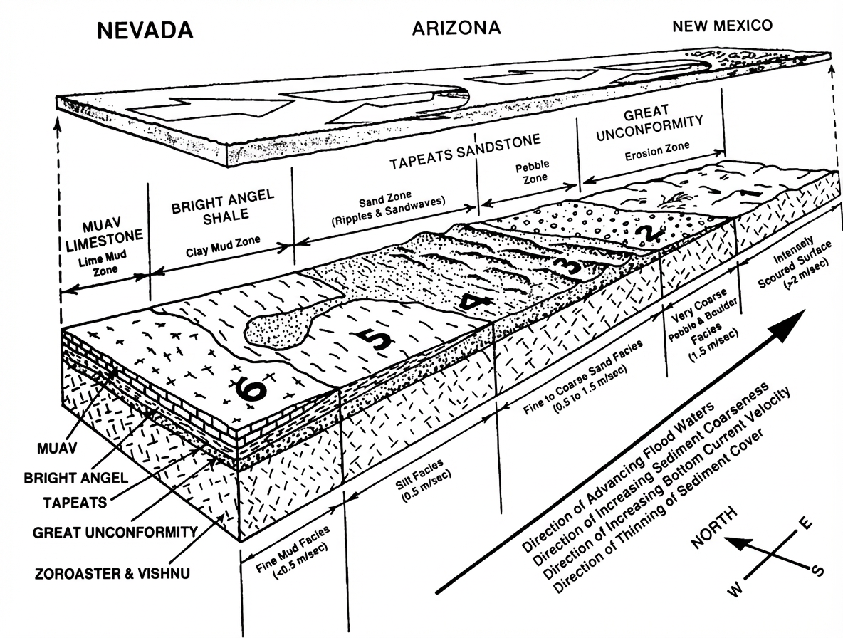 Il explique l’érosion de la zone dite Great Unconformity et le dépôt simultané (verticalement et latéralement) des trois faciès : Tapeats Sandstone (grès), Bright Angel (argile) et Muav Limestone (calcaire).