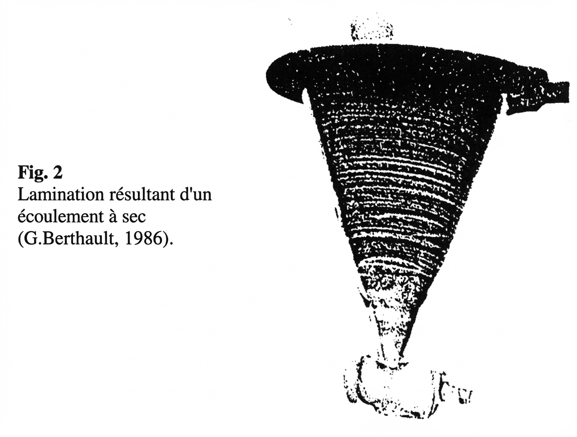 En fait, les phénomènes: lits stratifiés et ségrégation (lamination ), se conjuguent sur l’aire de dépôt. Une formulation en mécanique doit exprimer cette conjugaison.