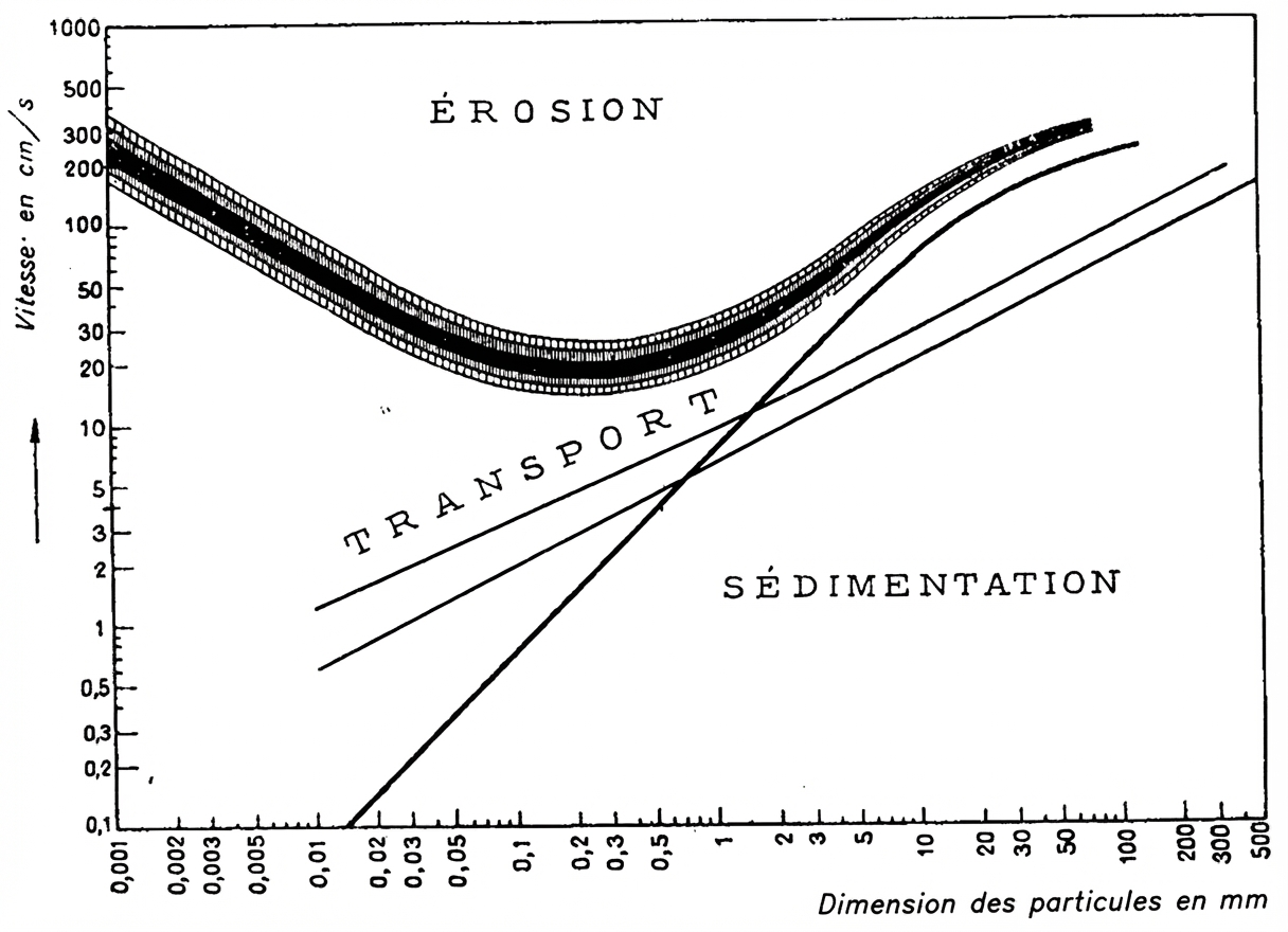 Quant aux lits stratifiés, produits par l’écoulement non uniforme du courant d’eau, on disposait déjà de courbes expérimentales limitant les domaines d’érosion, de transport et de sédimentation, établies dès 1935 par Hjulström .