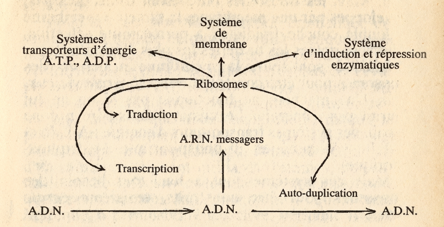 2. Mais il faut que cette information soit traduite, et d’abord qu’elle soit transcrite par les A.R.N. messagers. Or « le code ne peut être traduit que par des produits de traduction », premier cercle vicieux,signalé d’ailleurs par Jacques Monod lui‑même, dans Le Hasard et la Nécessité.