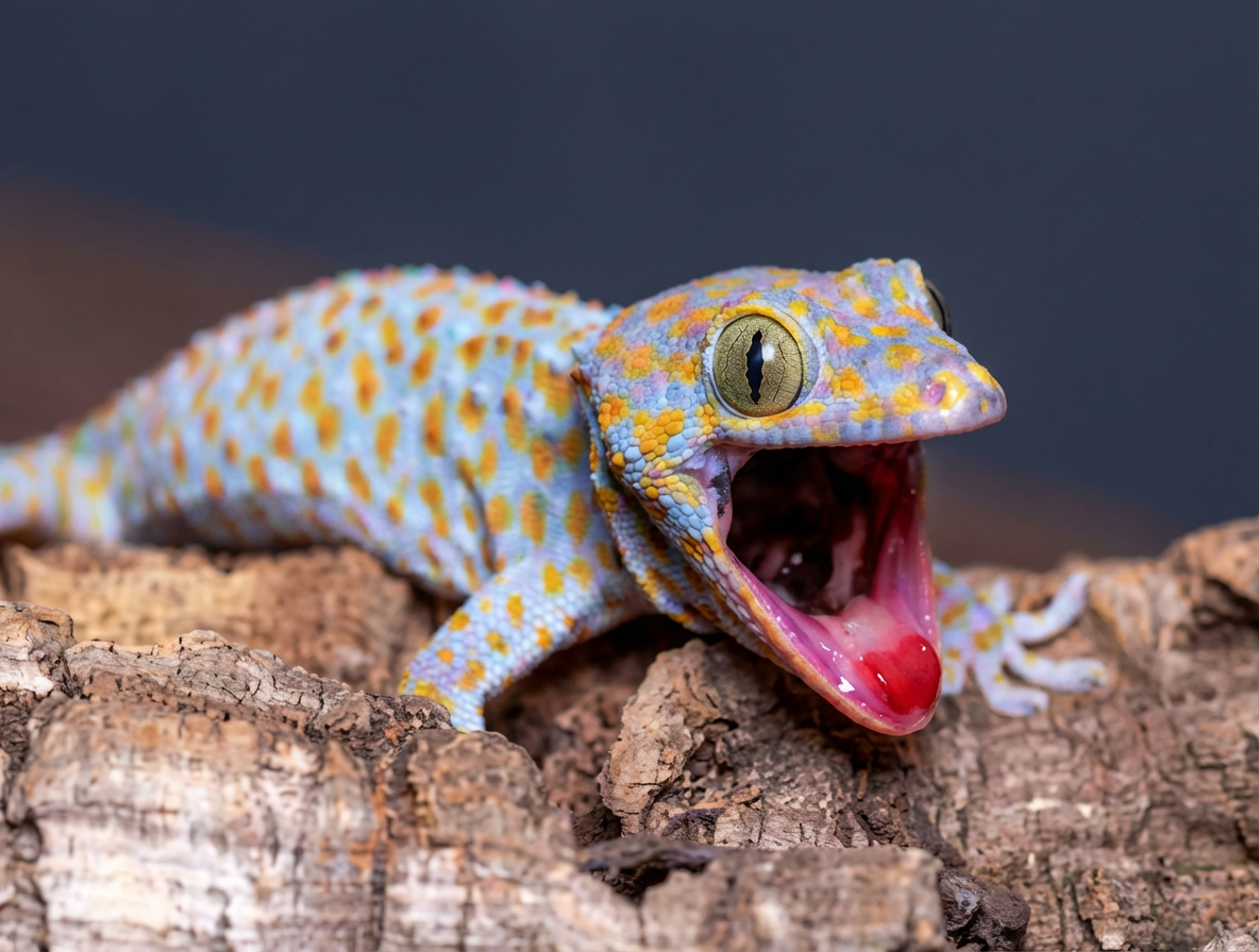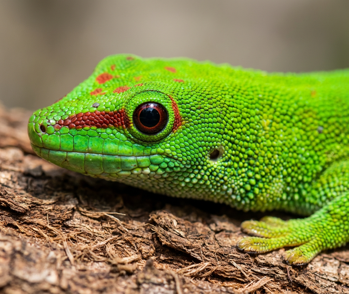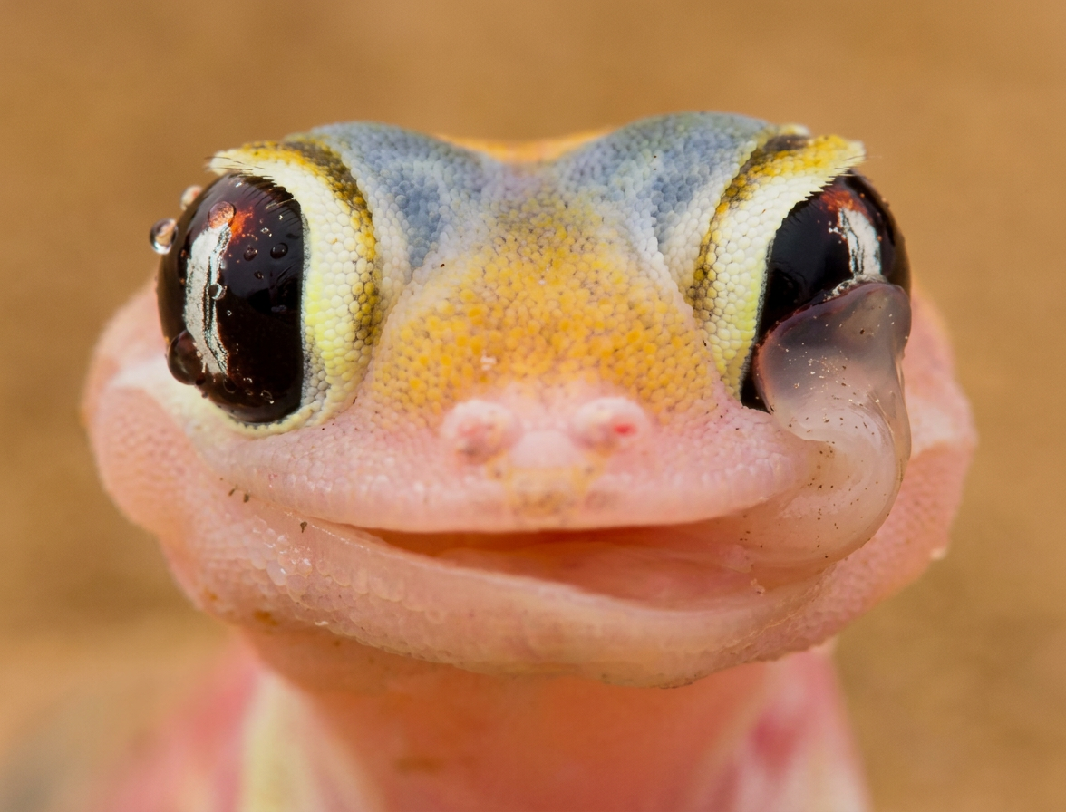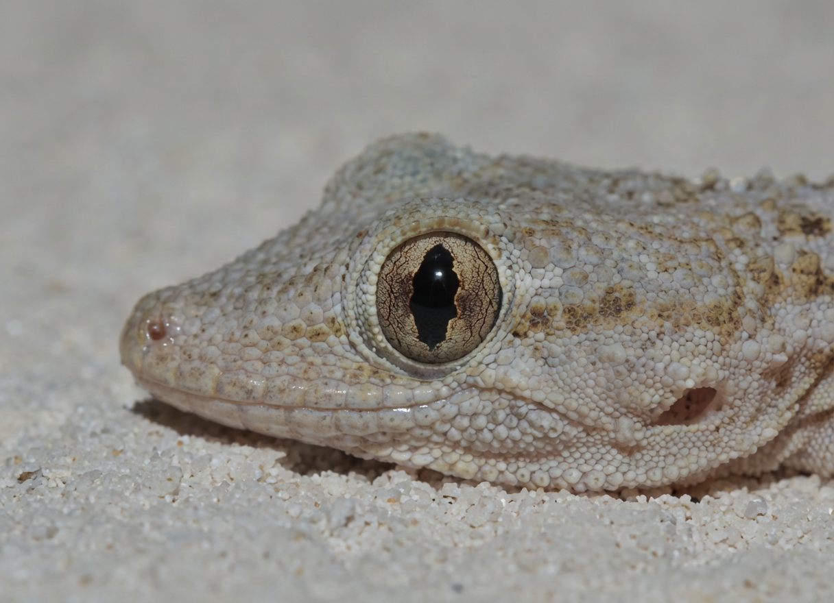 Comme tous les Geckos, excepté les espèces de la famille des Eublepharidæ, je n’ai pas de paupières. Lorsque j’ai besoin de me débarrasser de la poussière et de la saleté, afin de garder mes yeux propres et humides, je me lèche l’écaille transparente résultant de la fusion des paupières qui recouvre la cornée : la lunette pré-cornéenne ou écaille supra-oculaire.