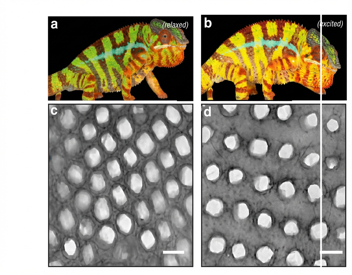 C’est la variation de la géométrie de minuscules « miroirs » présents dans la peau du reptile, en réalité des structures biologiques appelées « iridophores » ou guanophores, qui est à l’origine de ces changements de teintes [l’iridescence est la propriété de certaines surfaces qui semblent changer de couleur selon l’angle de vue ou d’illumination. L’iridescence est un terme plus spécifiquement réservé à la diffraction]. Ce serait donc un phénomène d’optique qui produit ces couleurs vives qu’arborent un certain nombre d’espèces diurnes.