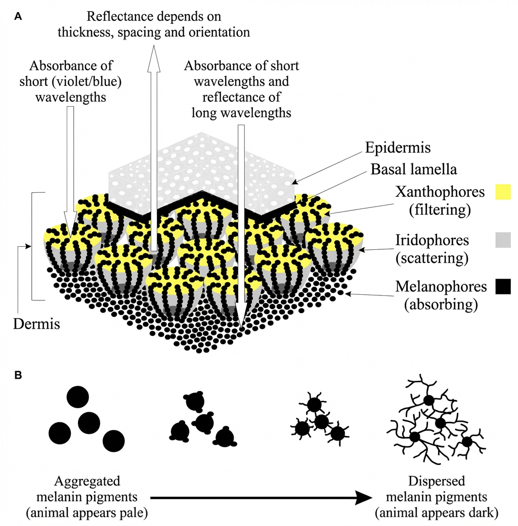 Chez les vertébrés poïkilothermes [voir étymologie p. 86], le chromatophore dermique de base comprend trois couches : des mélanophores basaux qui absorbent la lumière à toutes les longueurs d’onde, une couche d’iridophores qui réfléchit la lumière et une couche externe de xanthophores et d’érythrophores qui absorbent la lumière à courte longueur d’onde.