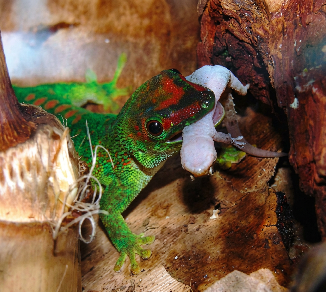 – Lorsqu’il s’agit d’échapper à un prédateur, la capacité d’abandonner une partie de notre peau et l’autotomie nous permettent quelquefois de conserver la vie. De nombreux Geckos sont en effet des chasseurs mais ils peuvent devenir des proies ! La rupture volontaire de la queue, ou autotomie, est une des caractéristiques les plus connues des Lézards terrestres. Celle-ci se produit lorsque nous sommes saisis par cet appendice. Des plans de fracture, passant par le corps des vertèbres caudales, permettent à l’extrémité de se détacher très brusquement, en même temps que les muscles se contractent, ce qui évite la perte de sang en comprimant les vaisseaux. Puis, rapidement, la queue repousse.