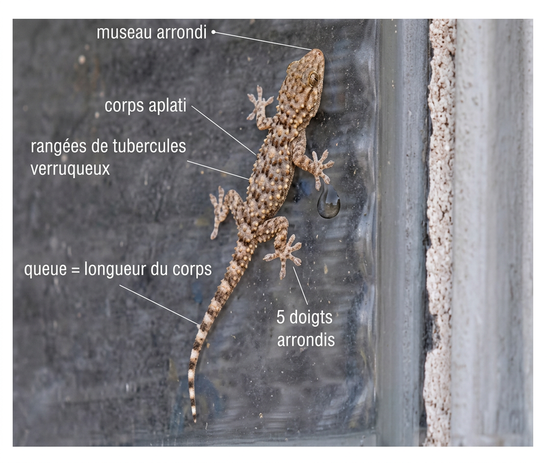 Bonjour ! Je m’appelle Tarentola mauritanica ou, plus simplement, gecko maure ou tarente. J’appartiens à la classe des Reptiles [N. B. Le terme « reptile » n’existe plus dans l’aberrante classification actuelle, dite phylogénétique. Elle change constamment. Pour rester intelligibles et régler les problèmes de nomenclature, les scientifiques proposent l’expression « reptiles non aviens » !], à l’ordre des Squamates, du latin squama, « écaille » [la classification des squamates est en pleine mutations sous l’impulsion des recherches et des découvertes, ce qui modifie les familles, les noms d’espèces, etc.], au sous-ordre des Sauriens – aujourd’hui, on n’appelle plus les lézards des sauriens mais des lépidosauriens, du grec lepis, « écorce, cosse », et sauros, « lézard » –, à l’infra-ordre Gekkota et à la famille des Phyllodactylidæ [l’infra-ordre Gekkota est divisé en sept familles, contenant environ 125 genres de geckos. La principale famille est celle des Geckonidés. Les espèces de la famille des Pygopodes ressemblent, elles, à des serpents].
