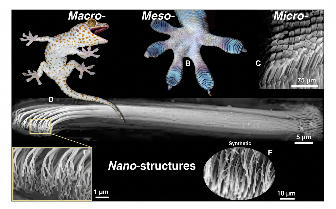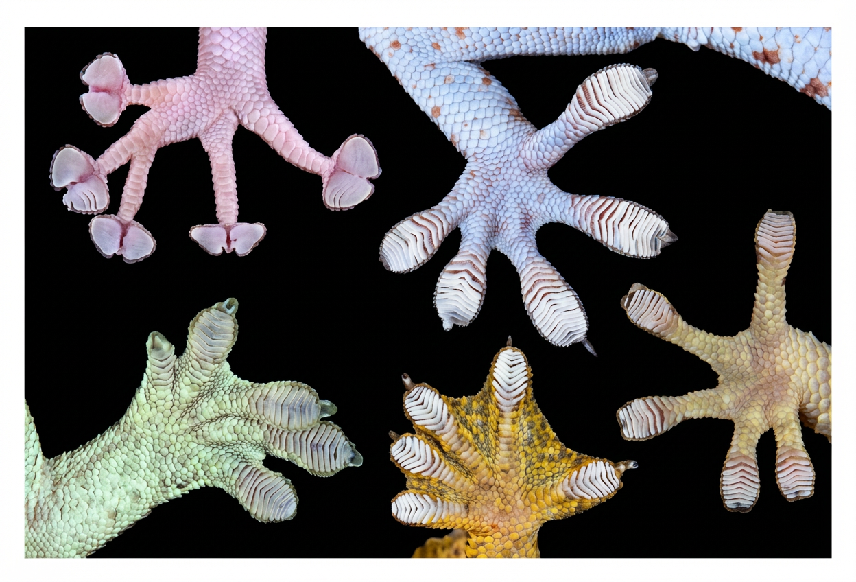 Ces poils s’accrochent aux moindres irrégularités du support. Si la surface de ce dernier est parfaitement polie, les Geckos sont incapables d’y grimper, mais, dans la pratique, rien n’est jamais totalement lisse, fût-ce une plaque de verre. Une fois bien implantés, ces crochets assurent une prise extrêmement solide. À chaque pas, l’animal doit plier et déplier les doigts pour dégager les crochets, mais le mouvement est si rapide qu’il n’est pas visible à l’œil nu. En cause, une batterie de petits muscles parfaitement agencés et coordonnés.