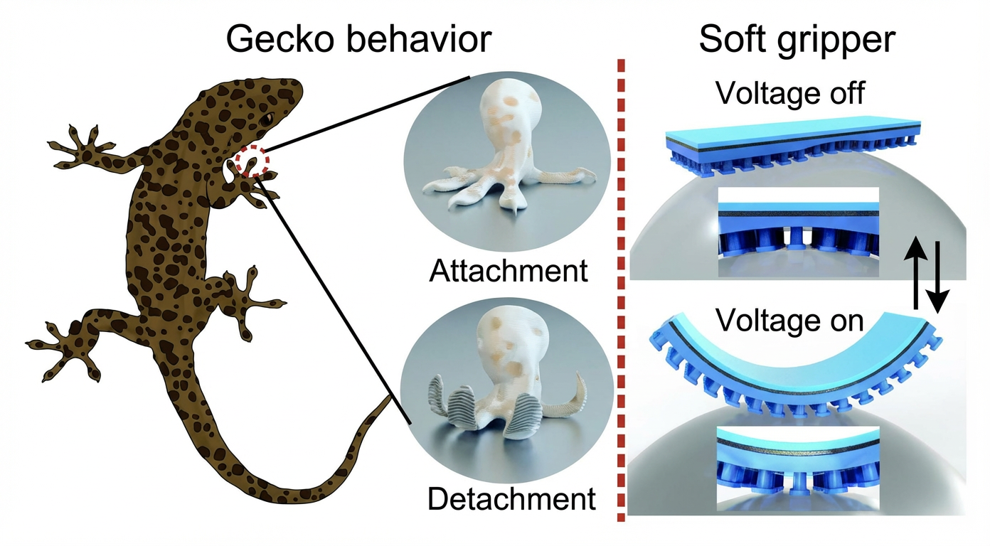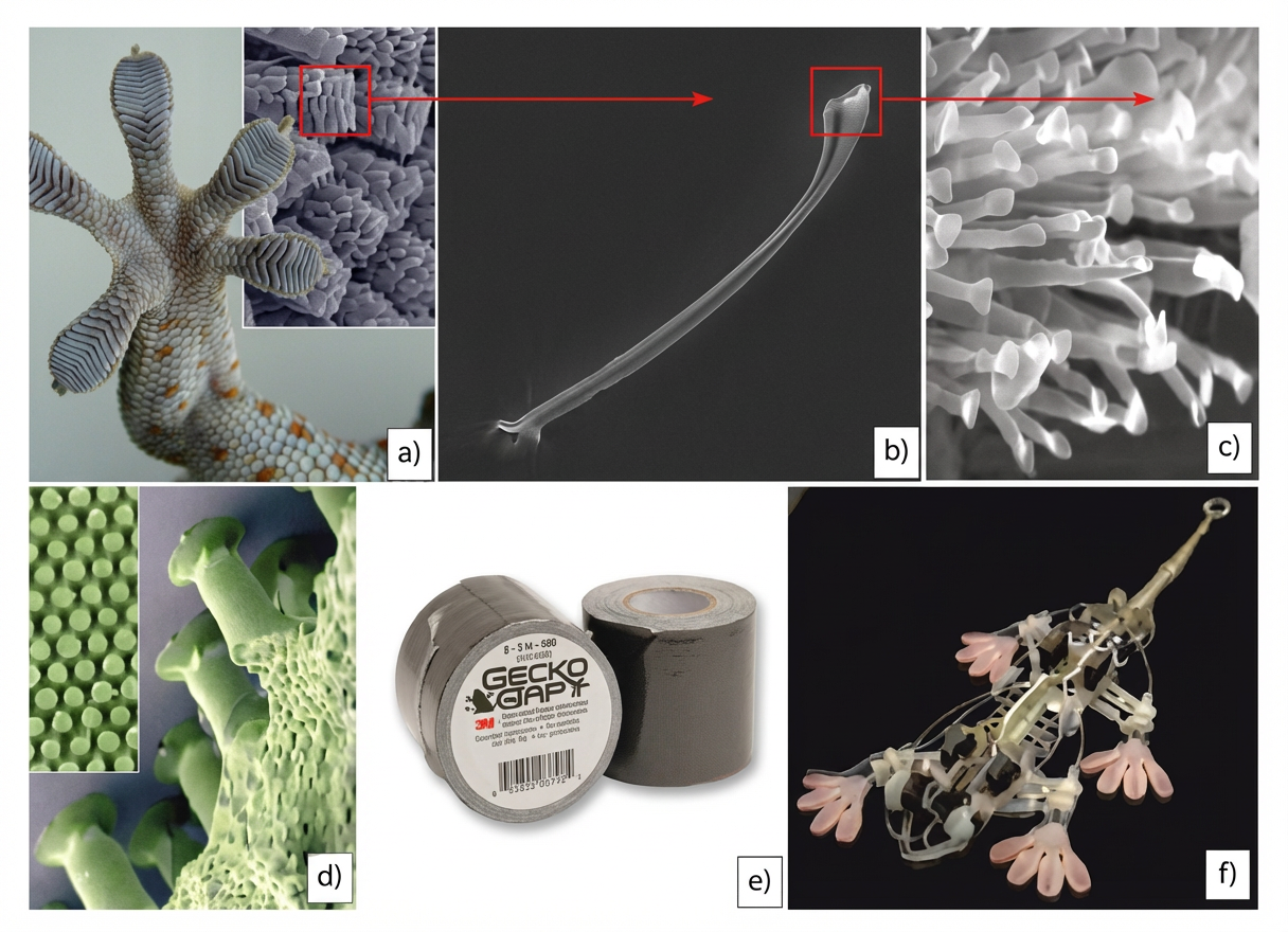 Les études de cinématique montrent que les geckos attachent et détachent leurs doigts en quelques millisecondes, un exploit qu’aucun adhésif classique ne peut égaler. Les orteils de Gecko peuvent être en hyperextension dans la direction opposée des doigts et des orteils humains. Cela leur permet de surmonter la force de van der Waals en décollant leurs orteils des surfaces des pointes vers l’intérieur. En outre, à l’inverse des autres adhésifs, les doigts des geckos ne se dégradent pas et ne se salissent pas : les soies sur les pieds des geckos sont autonettoyantes et éliminent généralement toute saleté.