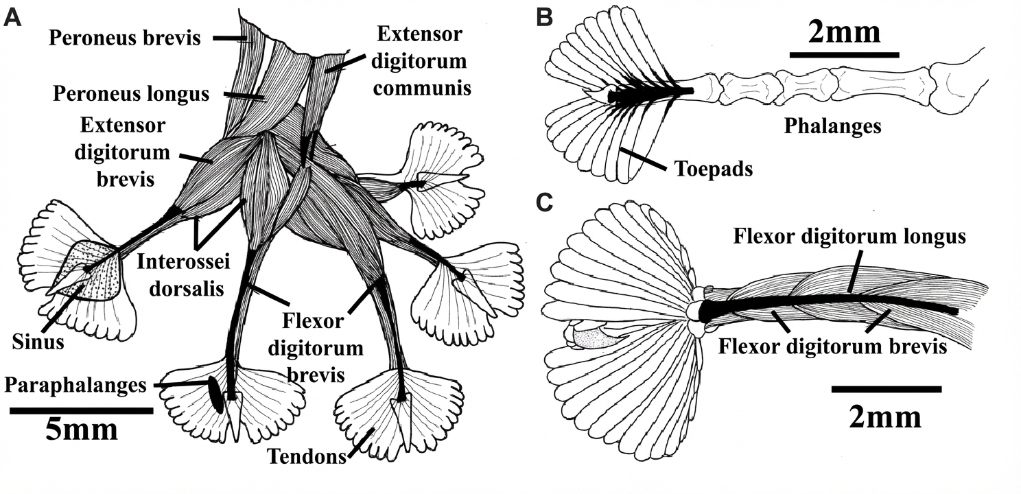 2 Ce coussinet digital est constitué d’une série de lamelles sèches nommées scansors, du latin scansor « ouvrier qui fait des escaliers », couvertes de fibres souples dites sétules, du latin sæta « soie de sanglier », à une densité de 14 400 par millimètre carré (mm).