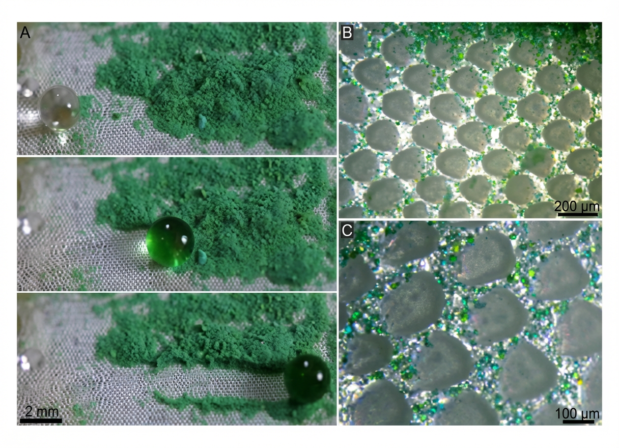 La topographie fournit également une barrière superhydrophobe anti-mouillante. Les gouttelettes d’eau suffisamment petites (10 à 100 μm) peuvent facilement accéder aux vallées entre les écailles pour un auto-nettoyage efficace. Elles vont alors englober les microparticules.