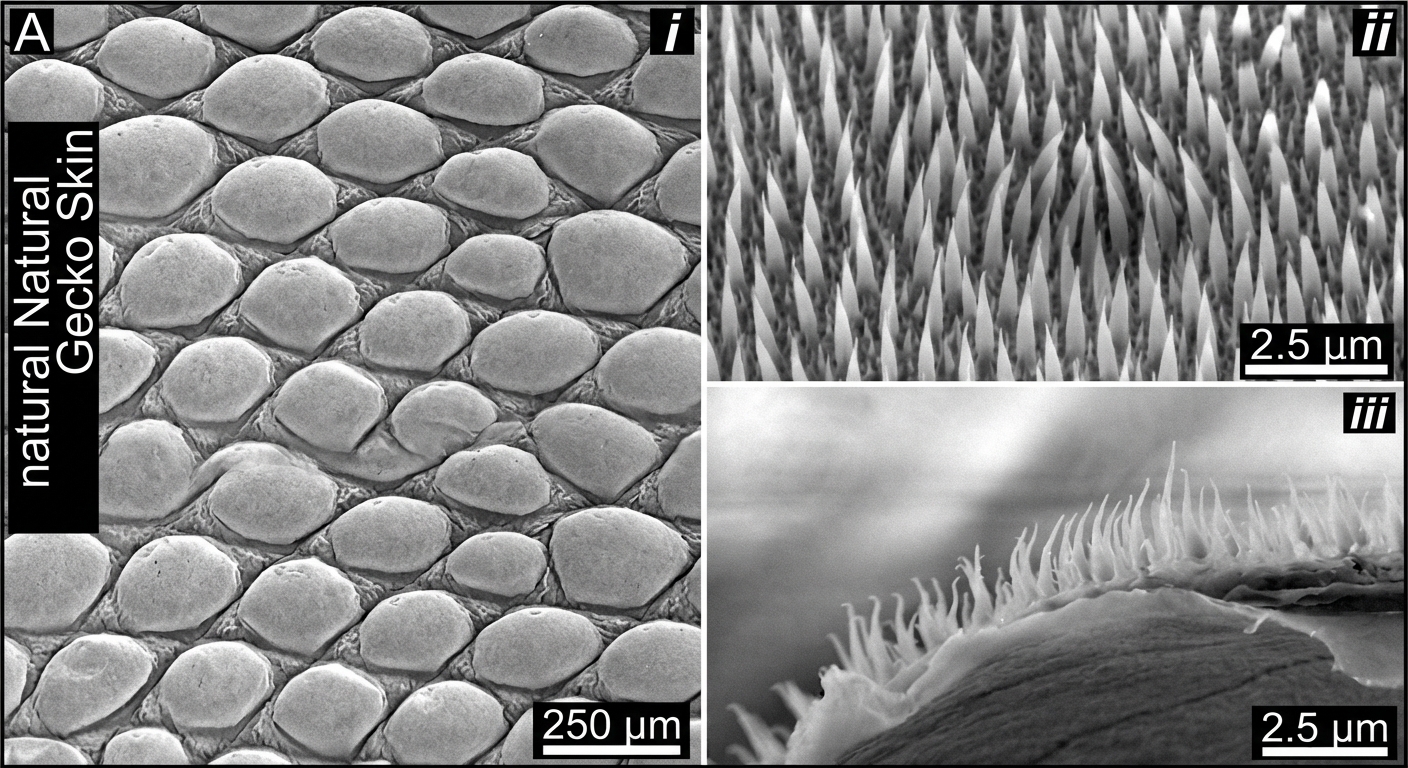Observée au microscope électronique à balayage, la structure de la peau du gecko Lucasium steindachneri d’Australie rappelle celle de la feuille de lotus. Elle est constituée d’écailles en forme de dôme disposées selon un motif hexagonal. Les écailles comprennent des spinules (poils), de plusieurs centaines de nanomètres à plusieurs microns de longueur, avec un espacement inférieur au micron et un petit rayon de courbure généralement de 10 à 20 nm. Cette structure micro et nano de la peau présente une adhérence ultra-faible avec les particules contaminantes.